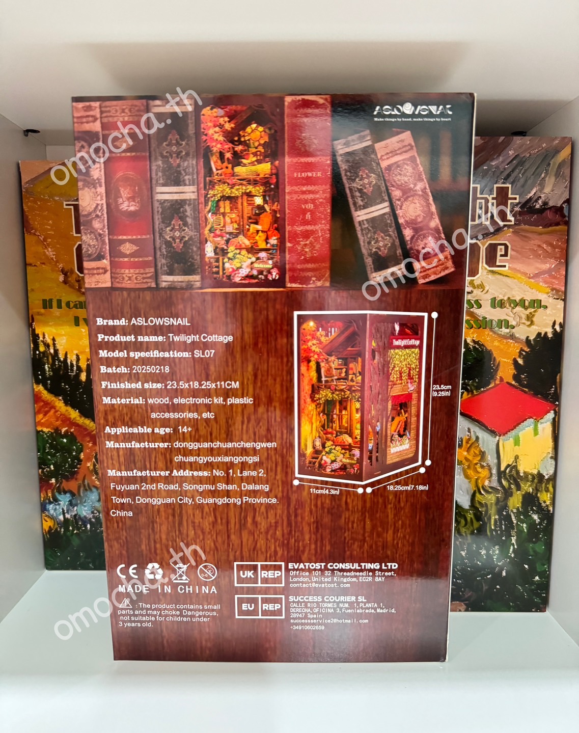 ยี่ห้อ : ASLOWSNAIL SL07 วัสดุ : ไม้ กระดาษ พลาสติก ผ้า และอื่นๆ ขนาดเมื่อประกอบเสร็จ : 23.5 x 18.25 x 11 ซม. ใช้เวลาประกอบ ประมาณ 8-10 ชม. เหมาะสำหรับเด็กอายุ 14 ปีขึ้นไป